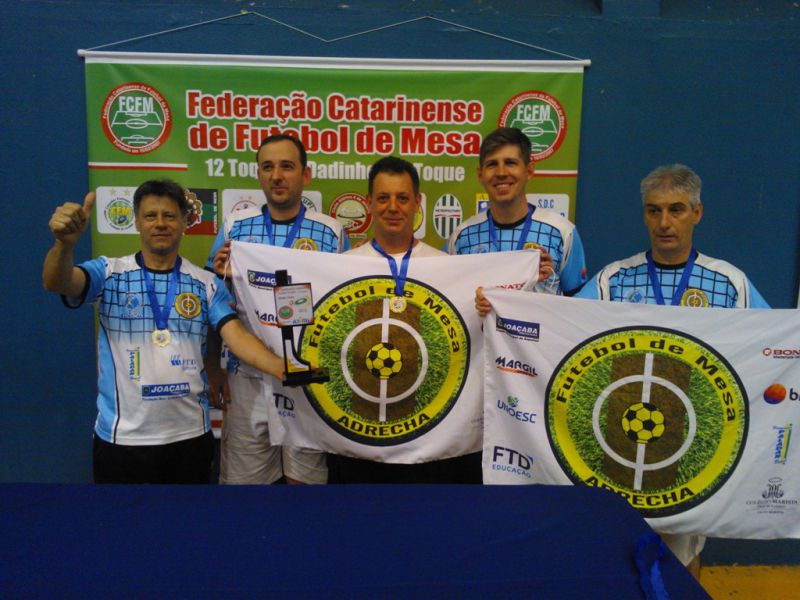 23/11/2015 O Futebol de Mesa da ADRECHA/FME Joaçaba/FTD Educação conquistou no final semana, em Itajaí, um título inédito para a agremiação e para o município, o de Campeão Estadual por equipes. Em segundo lugar ficou o Almirante Barroso, em terceiro o Marcílio Dias, ambos de Itajaí e a quarta colocação foi obtida pelo Metropolitano de Blumenau. O time campeão esteve formado pelos mesabotonistas Antonio Rodrgues (Tony), Cáudio Novack, Ivan Costenaro, Julio Hermes e Marcel Maia. Além deste belo triunfo, Tony e Cláudio sagraram-se vice-campeões estaduais das categorias Master e Adulto, respectivamente.