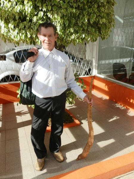28/05/2012 Um agricultor chamou a atenção por onde passava na manhã desta segunda-feira (28) em Joaçaba. Ele veio até o centro da cidade para exibir uma mandioca gigante colhida em sua propriedade em Linhas Duas Casas, interior do município. A mandioca de 1,20m de comprimento foi a atração. Segundo Armelindo Schneider, outra mandioca ainda maior já foi colhida no ano passado, mas ela teria quebrado antes do transporte para ser exibida aos amigos: